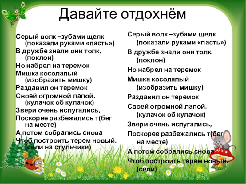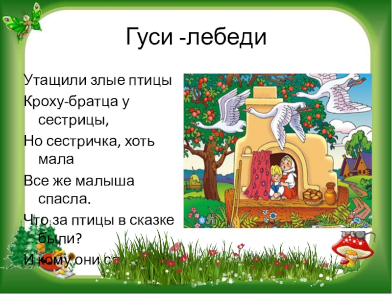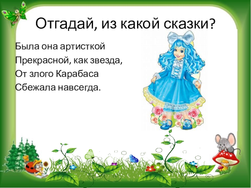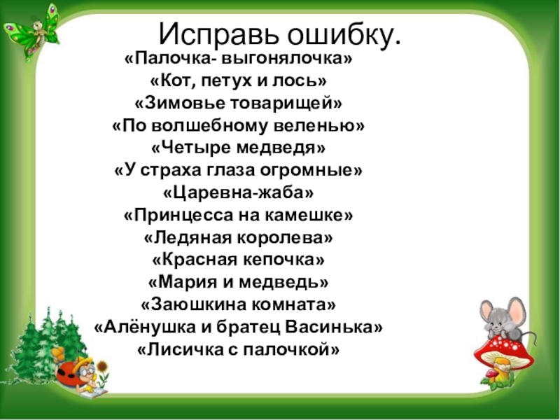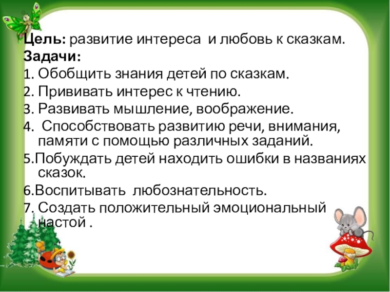 развитию речи, внимания, памяти с помощью различных заданий.5.Побуждать детей находить ошибки в названиях сказок.