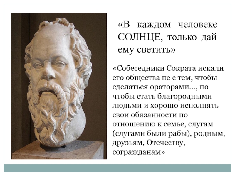 «В каждом человеке СОЛНЦЕ, только дай ему светить»«Собеседники Сократа искали его общества не с тем, чтобы сделаться