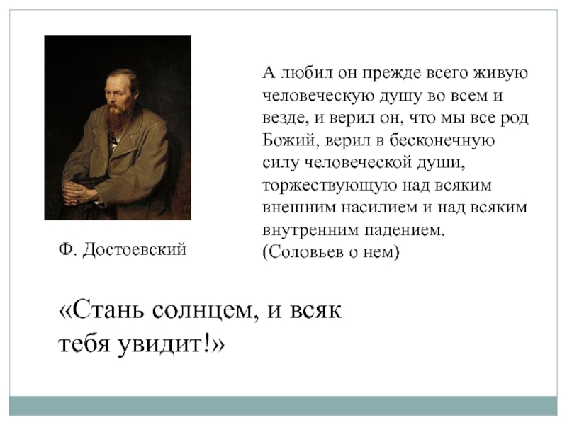 «Стань солнцем, и всяк тебя увидит!»Ф. Достоевский А любил он прежде всего живую человеческую душу во всем