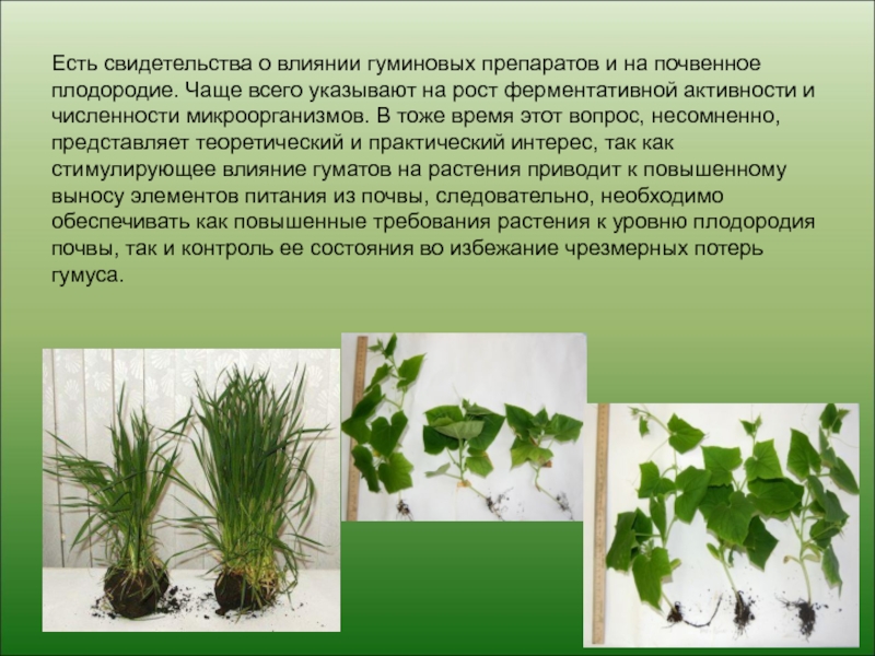 1. Воздействие гуминовых веществ на биологические мембраны. Это способствует улучшению поступления гуминовых веществ в растение.