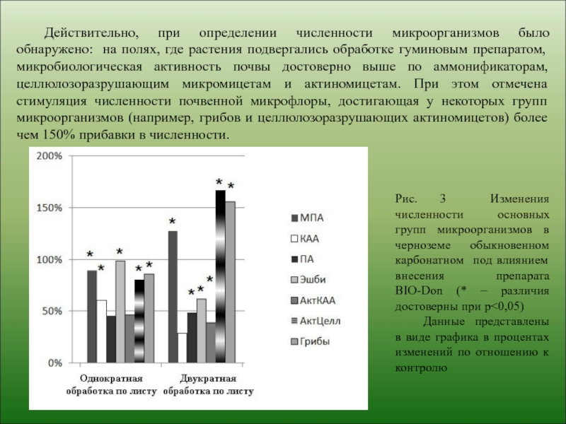 Рис. 3 Изменения численности основных групп микроорганизмов в черноземе обыкновенном карбонатном под влиянием внесения препарата BIO-Don (* – различия достоверны при p<0,05)
