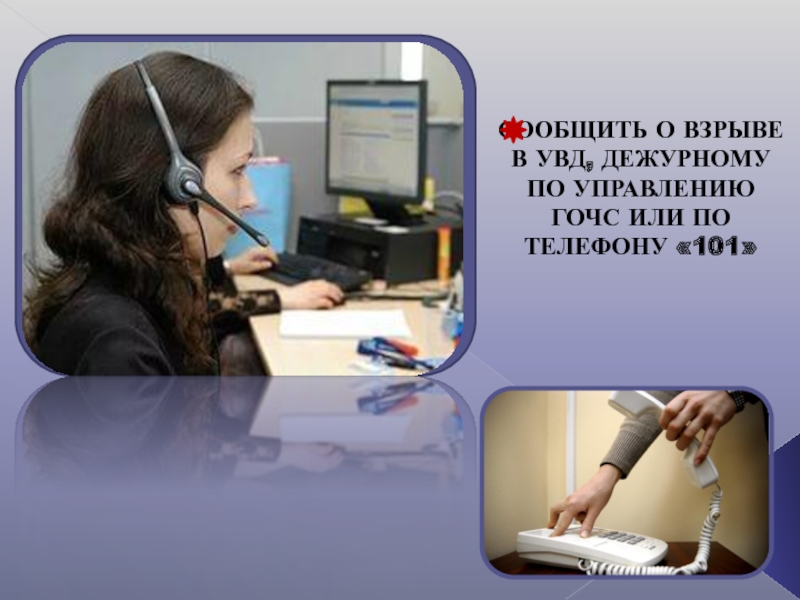 СООБЩИТЬ О ВЗРЫВЕ В УВД, ДЕЖУРНОМУ ПО УПРАВЛЕНИЮ ГОЧС ИЛИ ПО ТЕЛЕФОНУ «101»