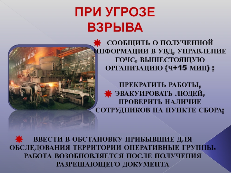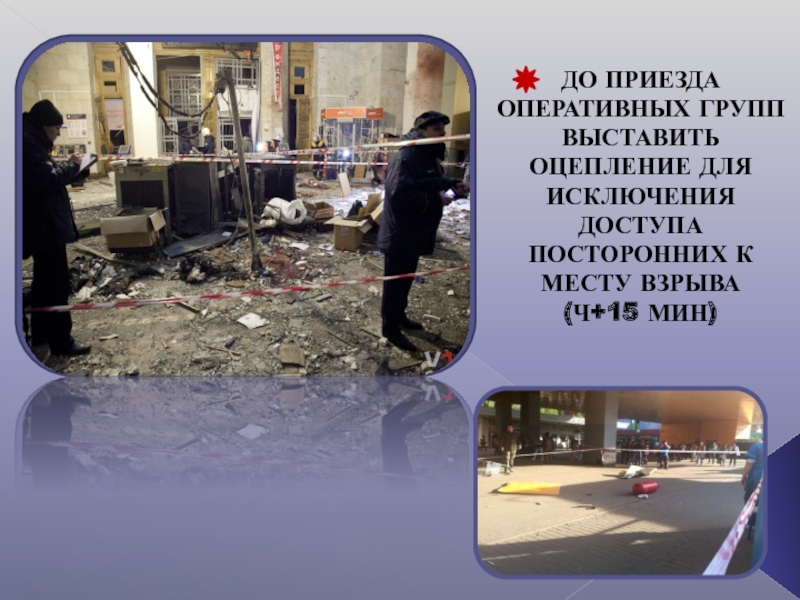 ДО ПРИЕЗДА ОПЕРАТИВНЫХ ГРУПП ВЫСТАВИТЬ ОЦЕПЛЕНИЕ ДЛЯ ИСКЛЮЧЕНИЯ ДОСТУПА ПОСТОРОННИХ К МЕСТУ ВЗРЫВА (Ч+15МИН)