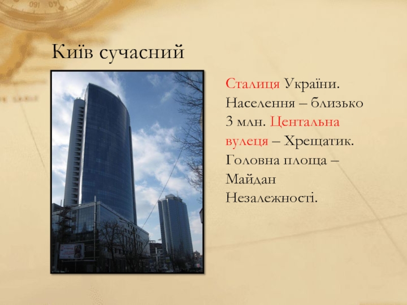 Київ сучаснийСталиця України. Населення – близько 3 млн. Центальна вулеця – Хрещатик.Головна площа – Майдан Незалежності.