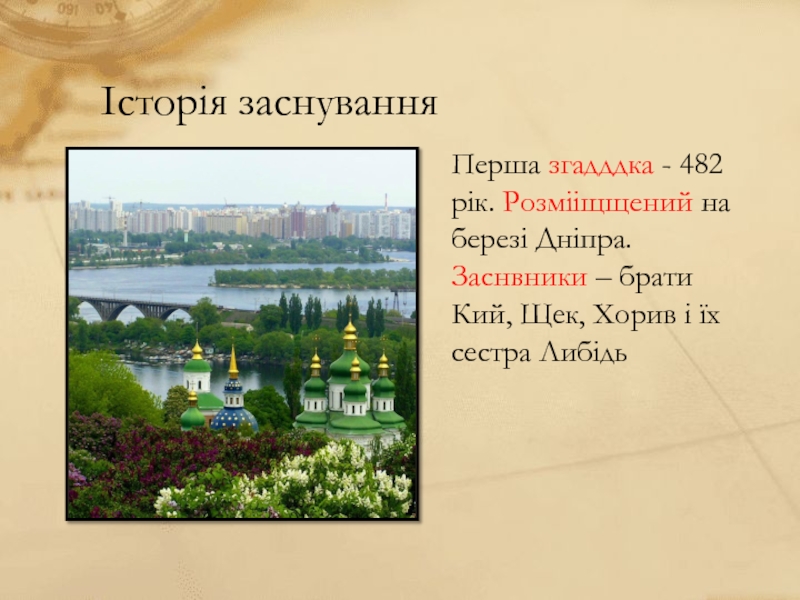 Історія заснуванняПерша згадддка - 482 рік. Розмііщщений на березі Дніпра. Заснвники – брати Кий, Щек, Хорив і їх сестра Либідь