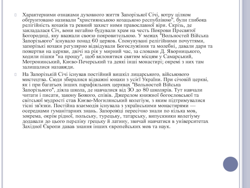 Слайд 8Характерними ознаками духовного життя Запорізької Січі, котру цілком обґрунтовано називали
