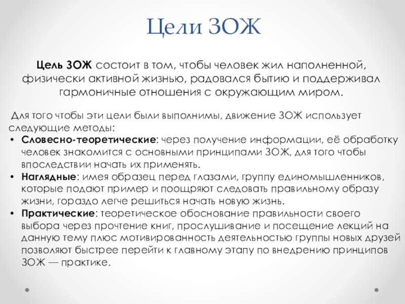 Словесно-теоретические: через получение информации, её обработку человек знакомится с основными принципами ЗОЖ, для того чтобы впоследствии начать их применять.