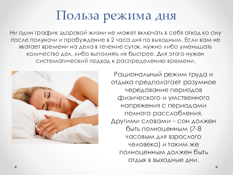 Ни один график здоровой жизни не может включать в себя отход ко сну после полуночи и пробуждение в 2 часа дня по выходным. Если вам не хватает времени на дела в течение суток, нужно либо уменьшать количество дел, либо выполнять их быстрее. Для этого нужен систематический подход к распределению времени.