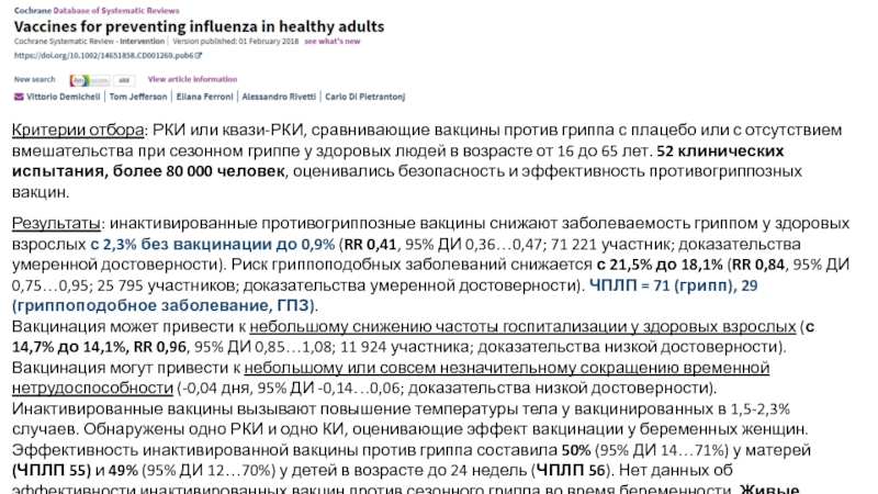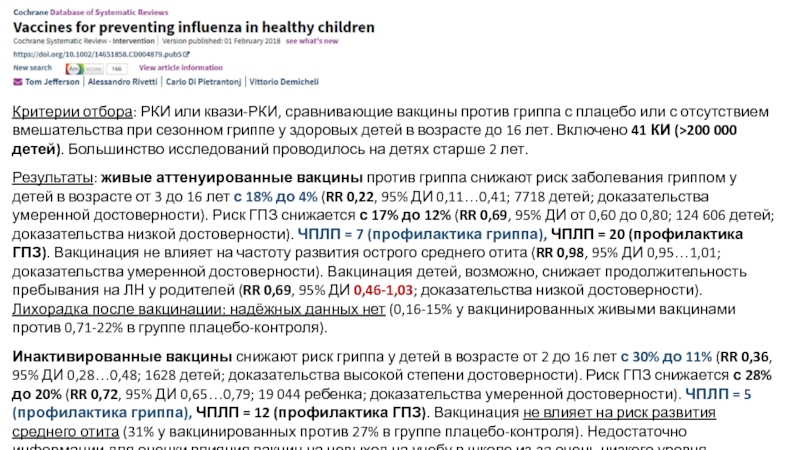 Слайд 2Критерии отбора: РКИ или квази-РКИ, сравнивающие вакцины против гриппа с