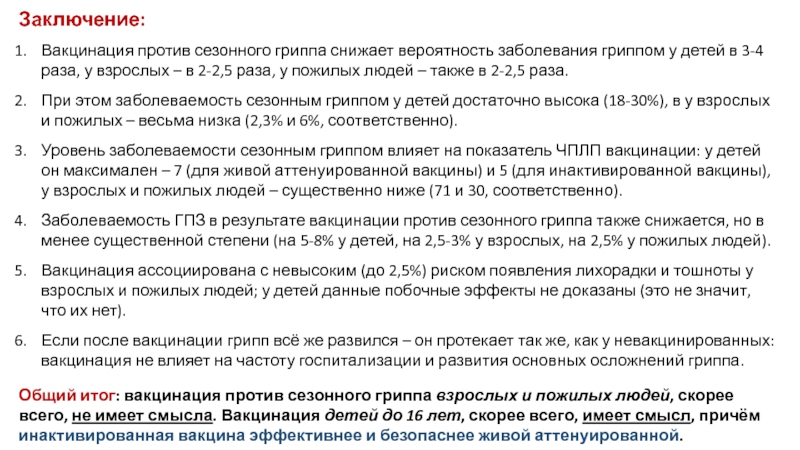 Общий итог: вакцинация против сезонного гриппа взрослых и пожилых людей, скорее всего, не имеет смысла. Вакцинация детей до 16 лет, скорее всего, имеет смысл, причём инактивированная вакцина эффективнее и безопаснее живой аттенуированной.