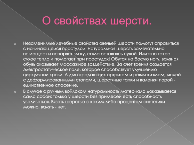 оставаясь сухой. Именно такое сухое тепло и помогает при простудах! Обутая на босую ногу, валяная обувь оказывает массажное воздействие. За счет трения создается электростатическое поле, которое способствует улучшению циркуляции крови. А для страдающих артритом и ревматизмом, людей с деформированными стопами, шерстяные тапки и валенки порой -единственное спасение.