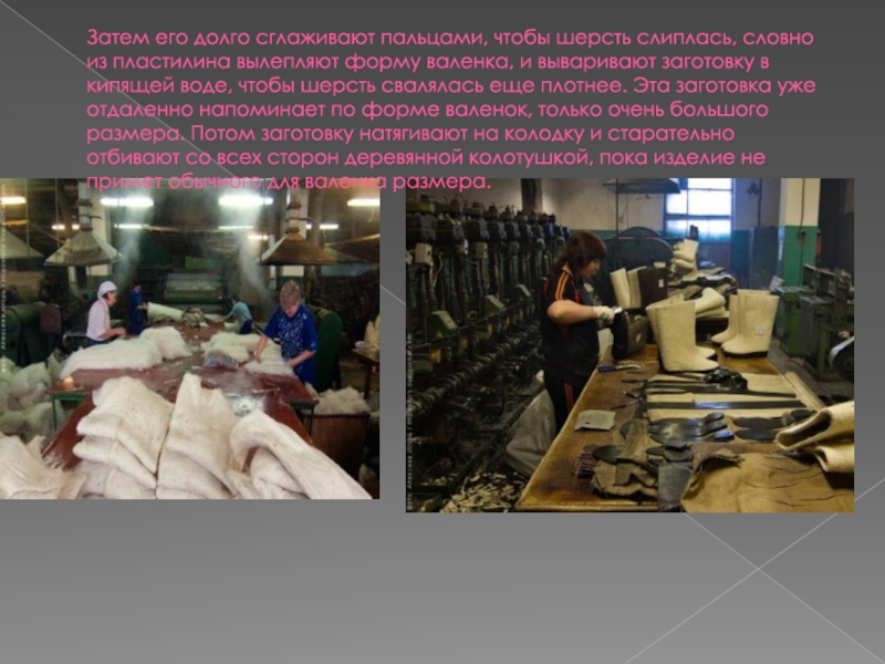 прадеды современных мастеров. Процесс несложный только на словах, на деле же здесь нужна физическая сила и много терпения, на которое способны немногие. По завершении всех этих процедур валенок отправляют сушиться, и его остается только побрить, чтобы он сделался гладким и блестящим.