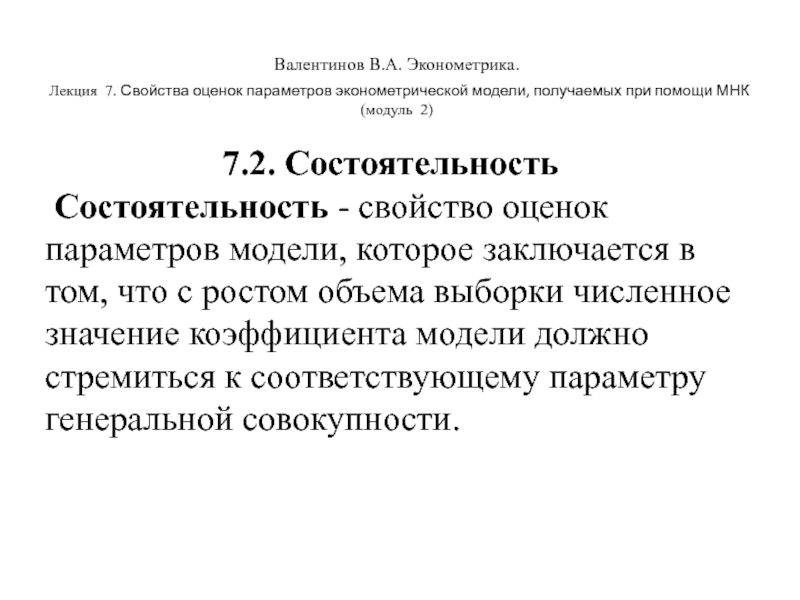 Валентинов В.А. Эконометрика. Лекция 7. Свойства оценок параметров эконометрической модели, получаемых при помощи МНК (модуль 2)7.2.