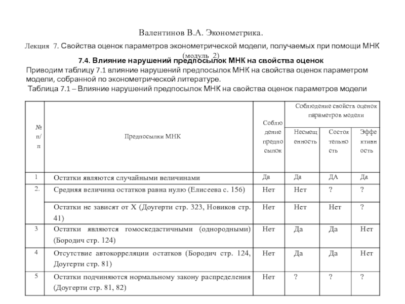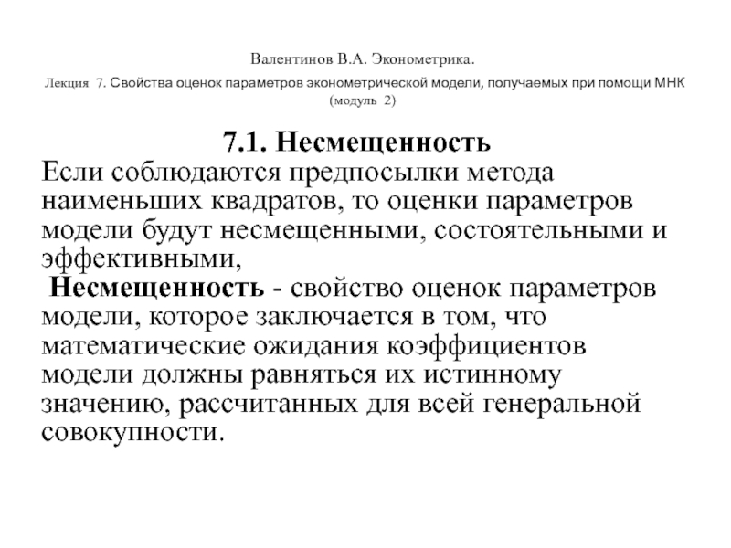 Валентинов В.А. Эконометрика. Лекция 7. Свойства оценок параметров эконометрической модели, получаемых при помощи МНК (модуль 2)7.1.