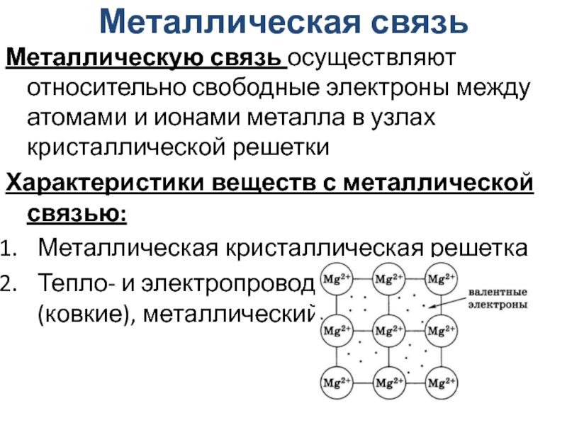 Металлическую связь осуществляют относительно свободные электроны между атомами и