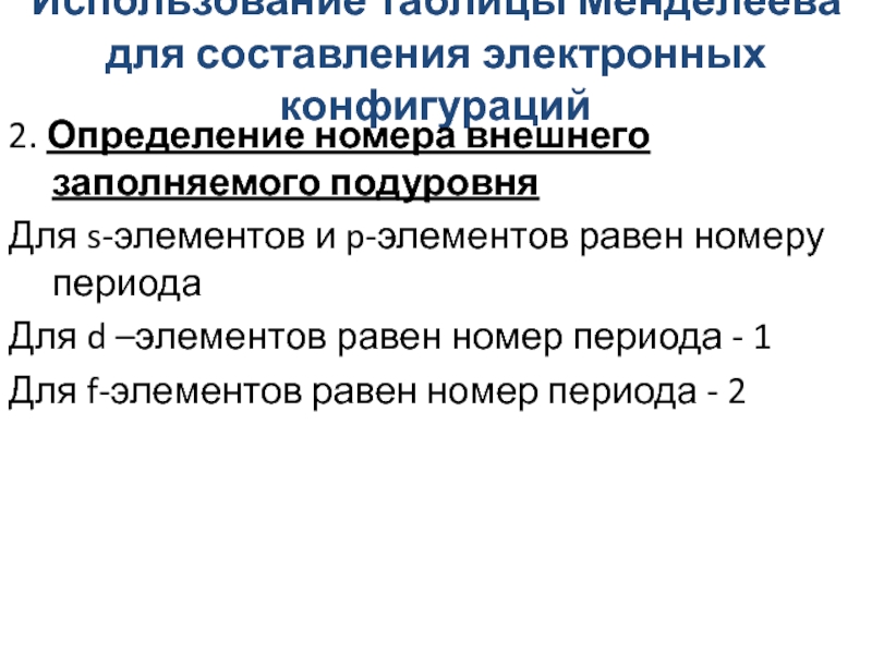 Слайд 16Использование таблицы Менделеева для составления электронных конфигураций