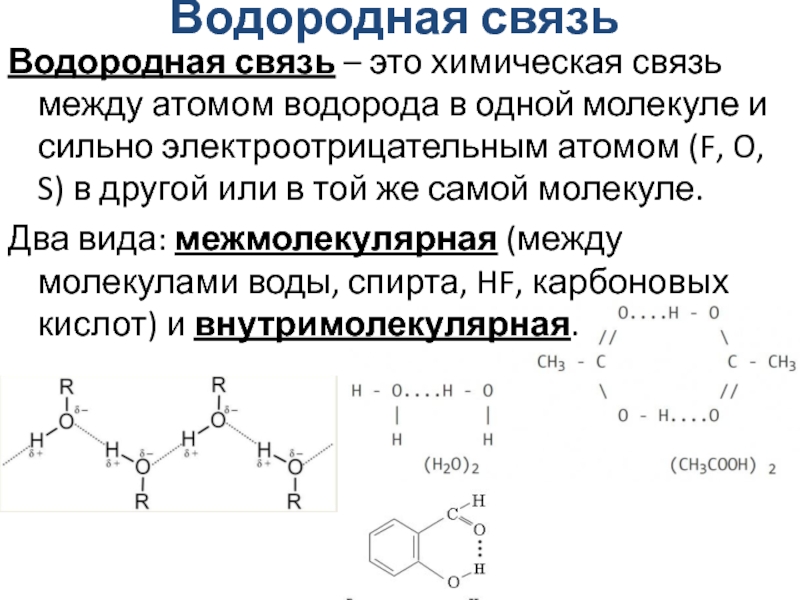 Два вида: межмолекулярная (между молекулами воды, спирта, HF, карбоновых кислот) и внутримолекулярная.