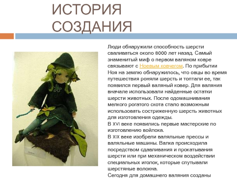 По прибытии Ноя на землю обнаружилось, что овцы во время путешествия роняли шерсть и топтали ее, так появился первый валяный ковер. Для валяния вначале использовали найденные остатки шерсти животных. После одомашнивания мелкого рогатого скота стало возможным использовать состриженную шерсть животных для изготовления одежды.В XVI веке появились первые мастерские по изготовлению войлока.