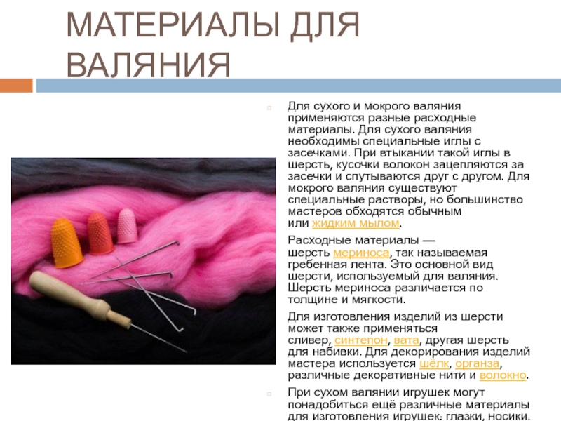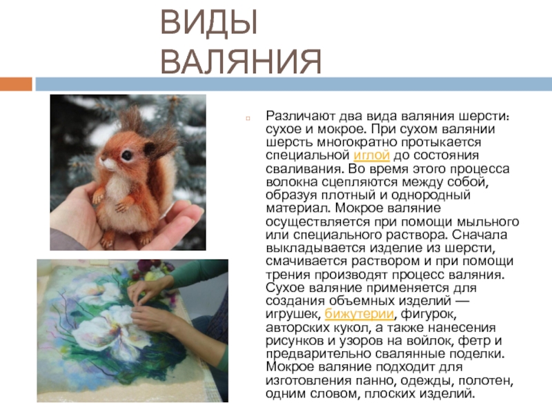 В XIX веке изобрели валяльные прессы и валяльные машины. Валка происходила посредством сдавливания и прокатывания шерсти или при механическом воздействии специальных иголок, которые спутывали шерстяные волокна.