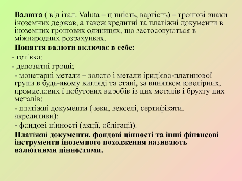 Слайд 2Валюта ( від італ. Valuta – цінність, вартість) – грошові