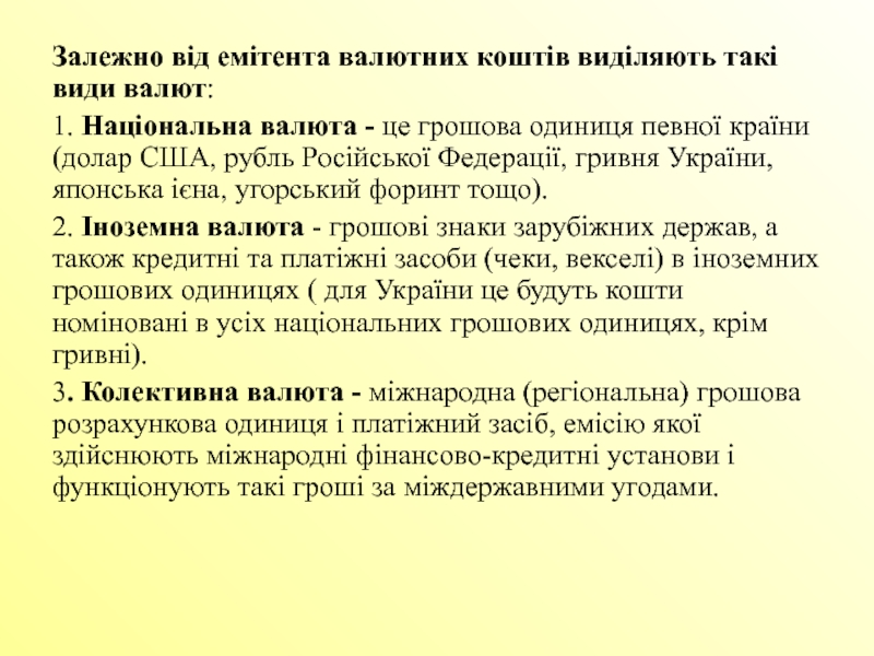 Слайд 4Залежно від емітента валютних коштів виділяють такі види валют:
