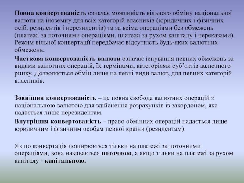 нерезидентів) та за всіма операціями без обмежень (платежі за поточними операціями, платежі за рухом капіталу і переказами). Режим вільної конвертації передбачає відсутність будь-яких валютних обмежень.