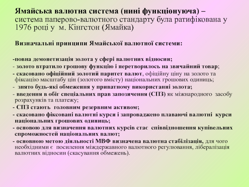 Слайд 30Ямайська валютна система (нині функціонуюча) – система паперово-валютного стандарту була