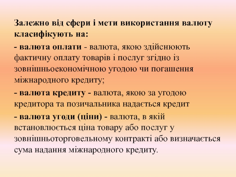 Слайд 9Залежно від сфери і мети використання валюту класифікують на: