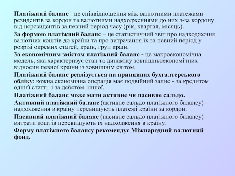 Слайд 36Платіжний баланс - це співвідношення між валютними платежами резидентів за