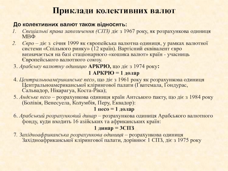 3. Колективна валюта - міжнародна (регіональна) грошова розрахункова одиниця і платіжний засіб, емісію якої здійснюють міжнародні фінансово-кредитні установи і функціонують такі гроші за міждержавними угодами.