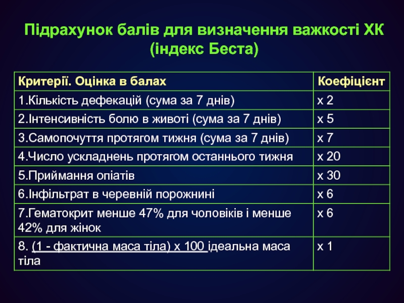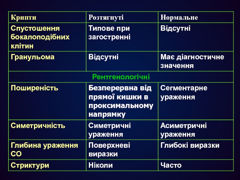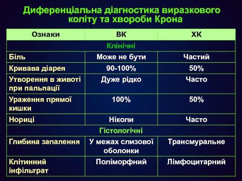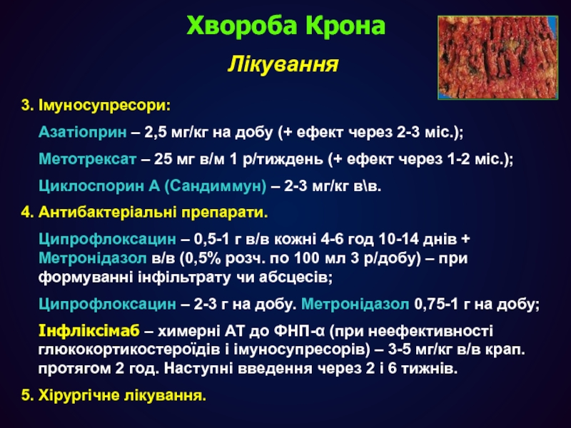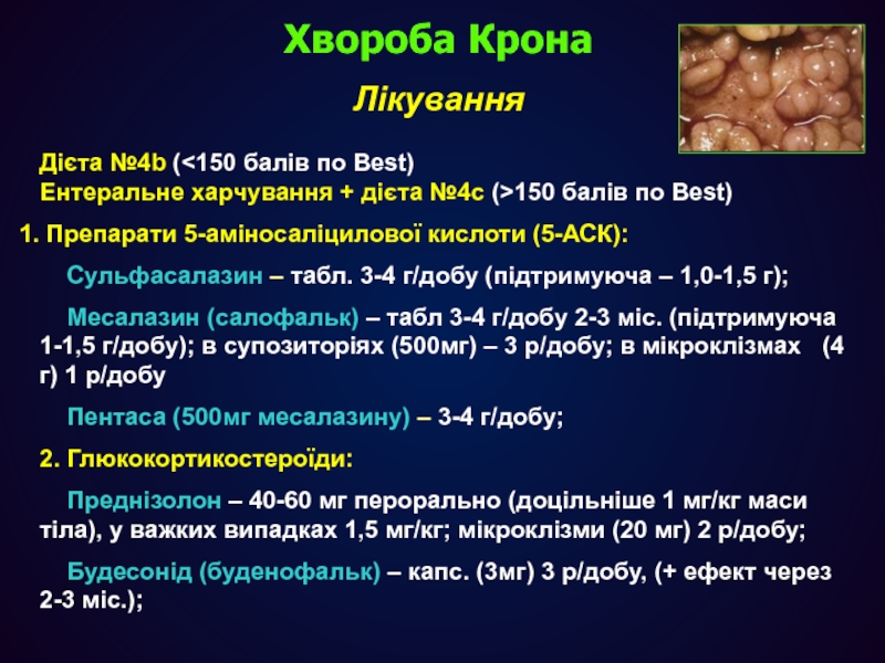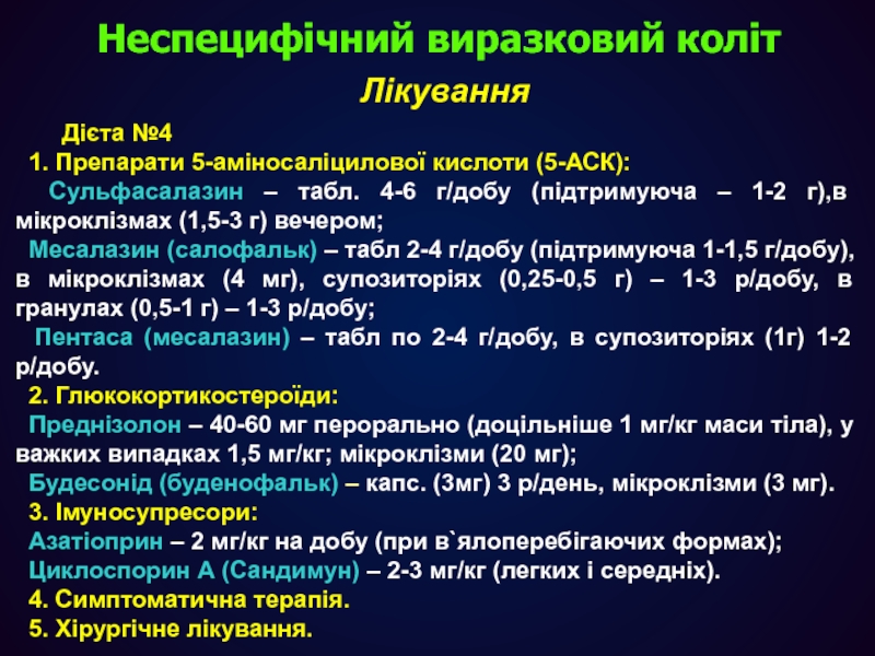 Месалазин (салофальк) – табл 3-4 г/добу 2-3 міс. (підтримуюча 1-1,5 г/добу); в супозиторіях (500мг) – 3 р/добу; в мікроклізмах (4 г) 1 р/добу