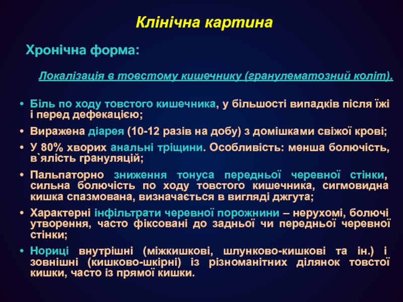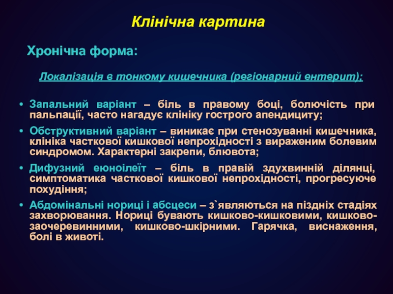 Обструктивний варіант – виникає при стенозуванні кишечника, клініка часткової кишкової непрохідності з вираженим болевим синдромом. Характерні закрепи, блювота;
