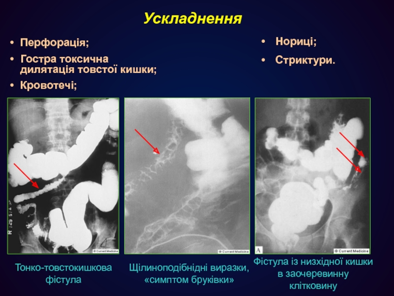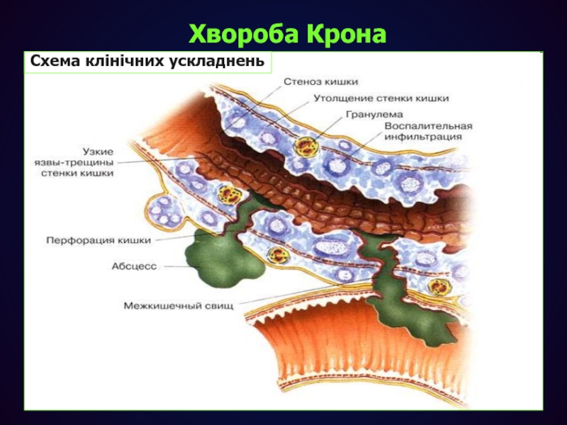 Абдомінальні нориці і абсцеси – з`являються на піздніх стадіях захворювання. Нориці бувають кишково-кишковими, кишково-заочеревинними, кишково-шкірними. Гарячка, виснаження, болі в животі.