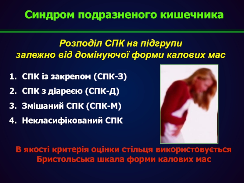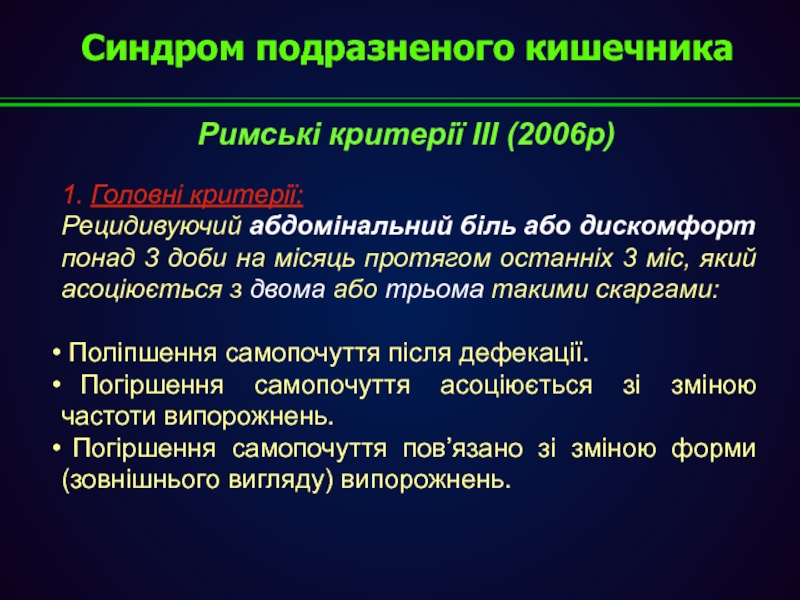 тижнів, які характеризуються болем і/або дискомфортом в животі, зменшуються після дефекації і супроводжуються зміною частоти, форми і консистенції стільця.