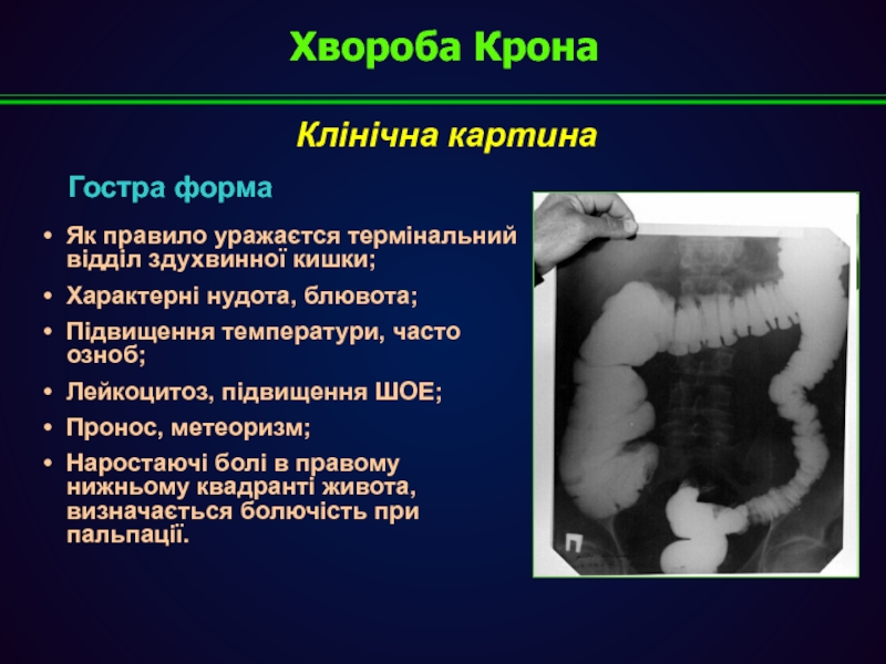 Дифузний еюноілеїт – біль в правій здухвинній ділянці, симптоматика часткової кишкової непрохідності, прогресуюче похудіння;