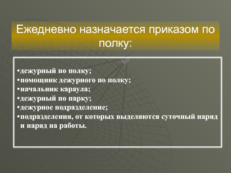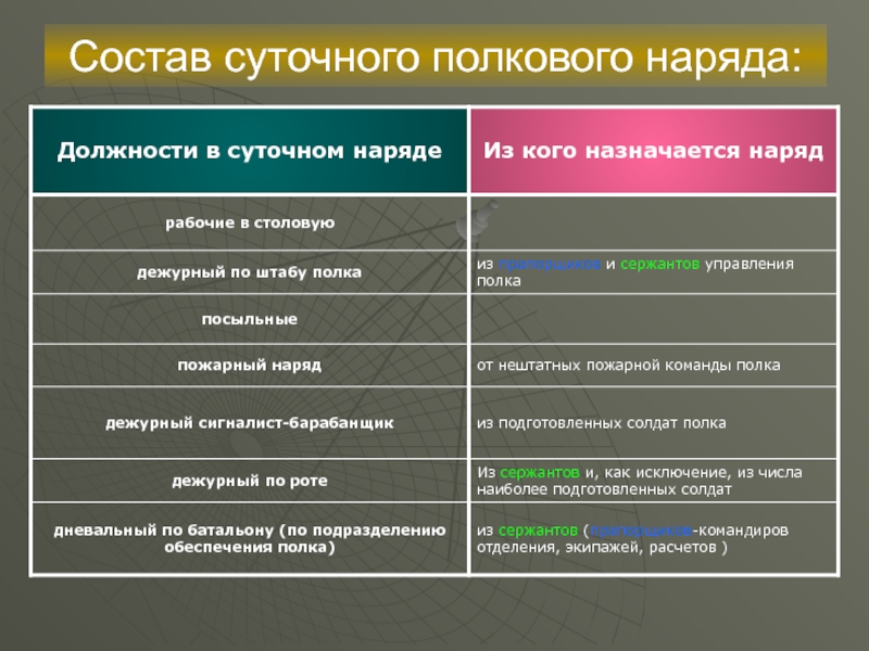 дежурный по штабу полка(офицеры, прапорщики, сержанты );