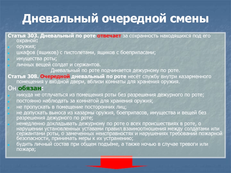 Статья 308. Очередной дневальный по роте несёт службу внутри казарменного помещения у входной двери, вблизи комнаты для хранения оружия.
