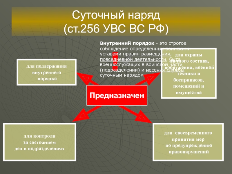 Внутренний порядок - это строгое соблюдение определенных воинскими уставами правил размещения, повседневной деятельности, быта военнослужащих в воинской части (подразделении) и несения службы суточным нарядом