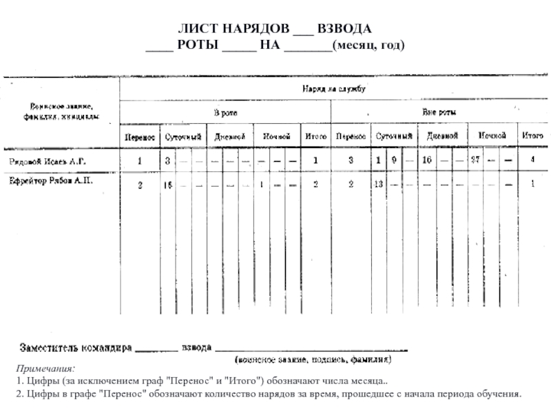 знать наличие в роте людей, количество находящихся в наряде, больных, арестованных (заключённых под стражу), уволенных из расположения полка или отправленных в составе команд;