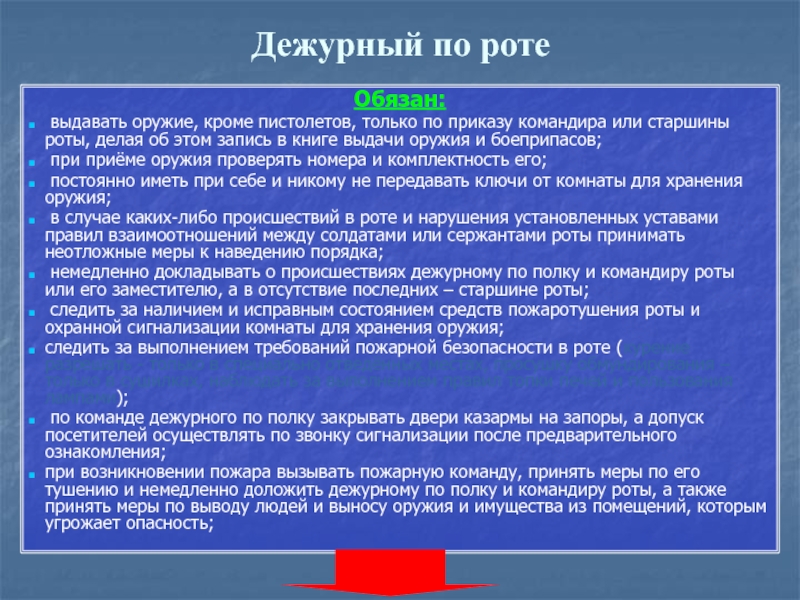 не допускать выноса из казармы оружия, боеприпасов, имущества и вещей без разрешения дежурного по роте;