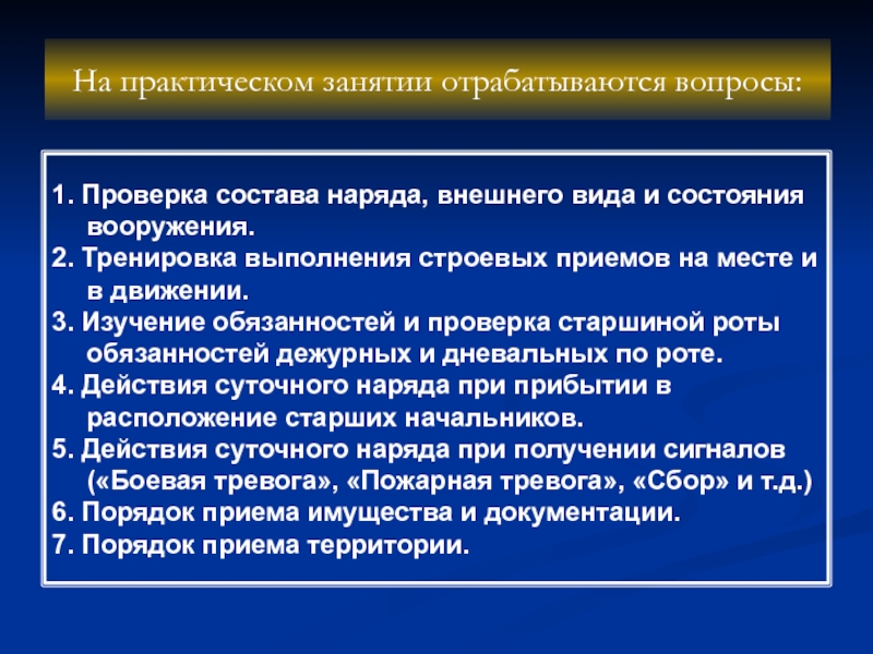 Изучить предназначение, состав и вооружение суточного наряда роты.