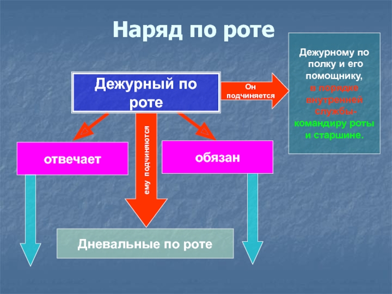по прибытии в роту других офицеров роты, старшины роты, а также военнослужащих не своей роты вызывать дежурного, например: «Дежурный по роте, на выход».