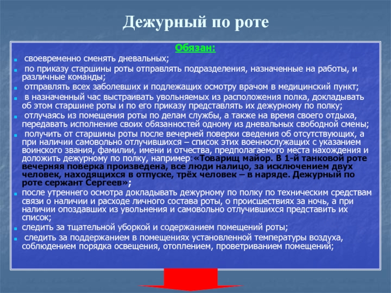 до прибытия в роту офицеров роты или старшины роты выполнять указания дежурного по полку;