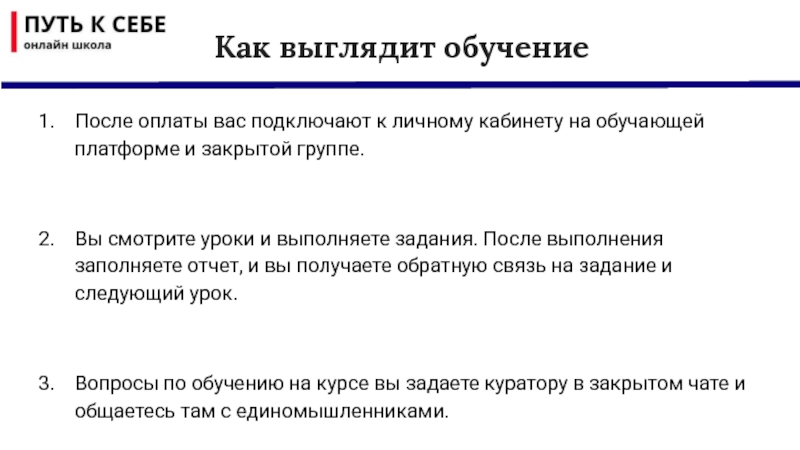 Вы смотрите уроки и выполняете задания. После выполнения заполняете отчет, и вы получаете обратную связь на задание и следующий урок.
