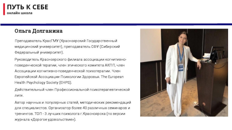 Руководитель Красноярского филиала ассоциации когнитивно-поведенческой терапии, член этического