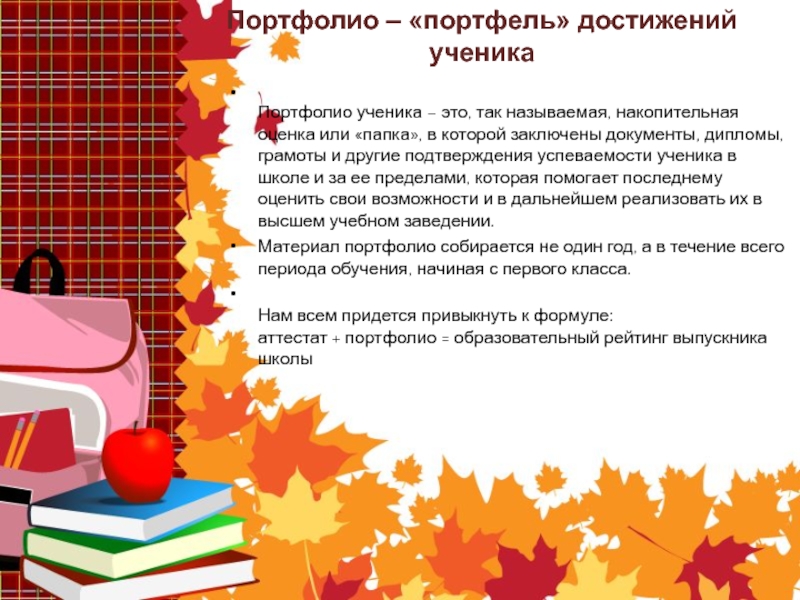 Портфолио ученика – это, так называемая, накопительная оценка или «папка»,