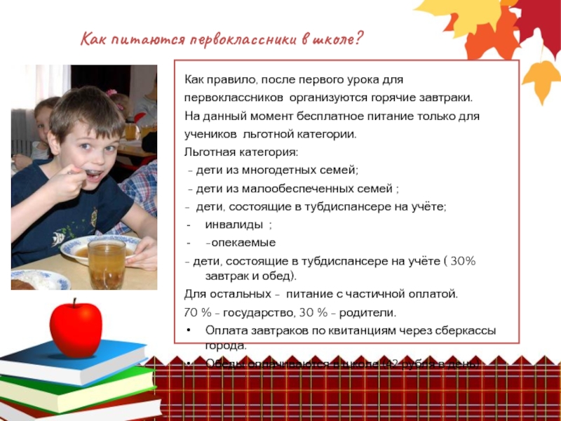 - дети, состоящие в тубдиспансере на учёте ( 30% завтрак и обед).