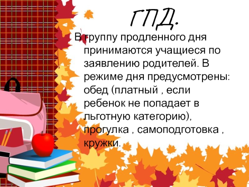 В группу продленного дня принимаются учащиеся по заявлению родителей. В