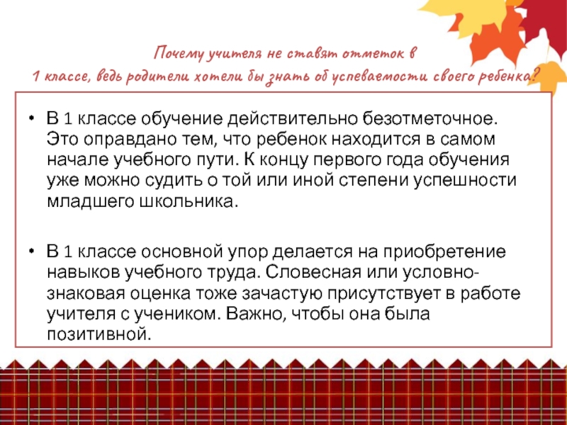 В 1 классе основной упор делается на приобретение навыков учебного труда. Словесная или условно-знаковая оценка тоже зачастую присутствует в работе учителя с учеником. Важно, чтобы она была позитивной.