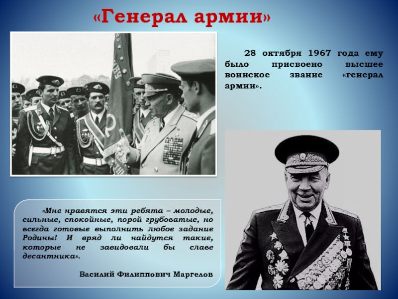 в создание Воздушно-десантных войск, обладающих высочайшей степенью мобильности и совершенной боевой техникой, средствами поражения и управления, имеющих крепкие традиции, высокий моральный дух и отличную боевую выучку»Генерал армии, Герой Советского Союза